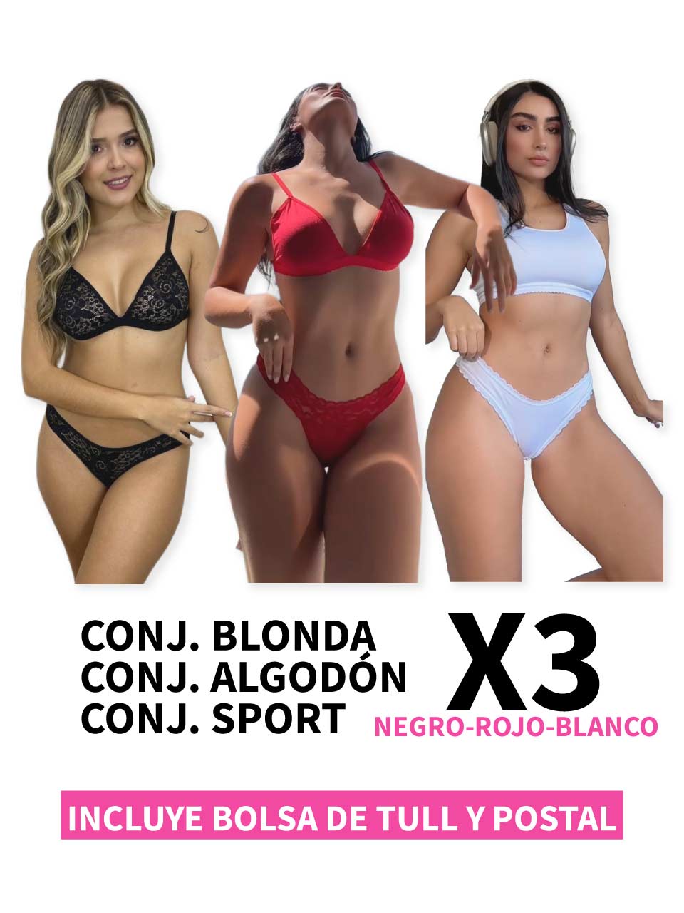💗Incluye 1 conjunto sport blanco + 1 conjunto blonda negro + 1 conjunto algodon rojo